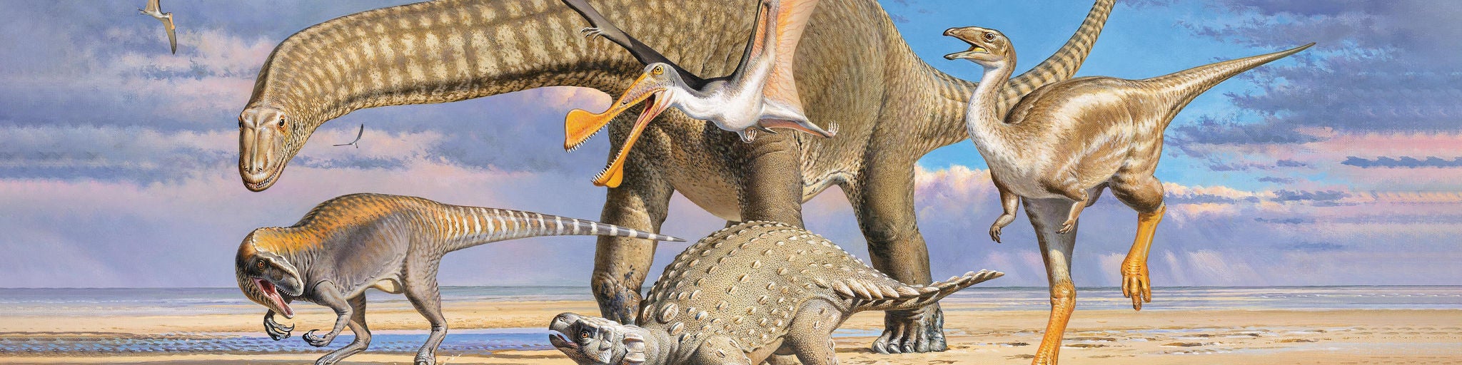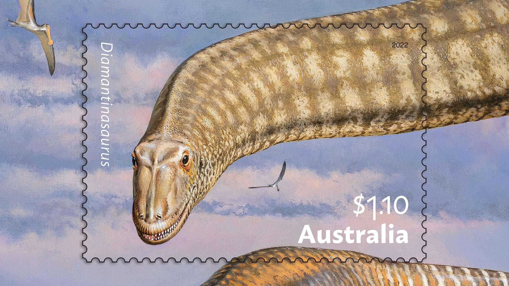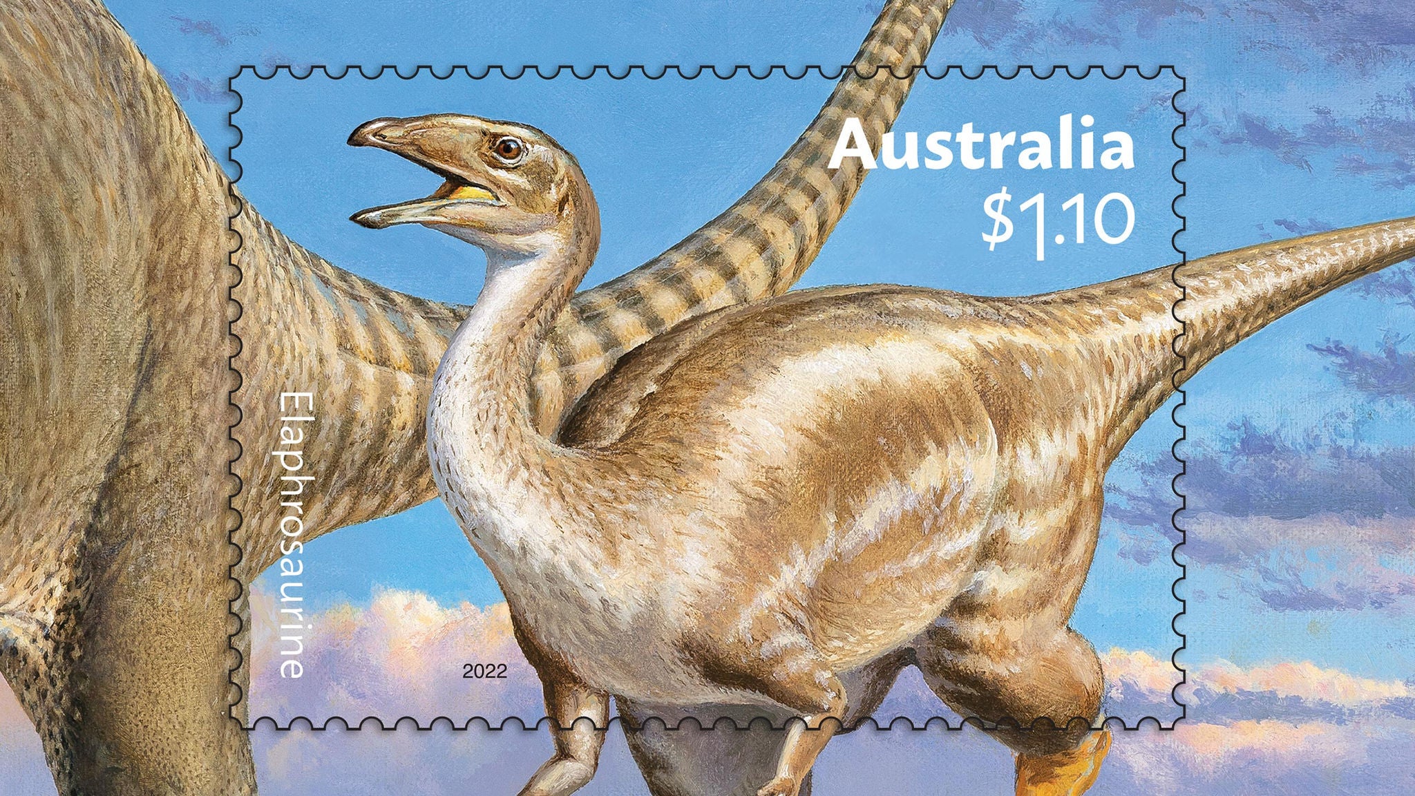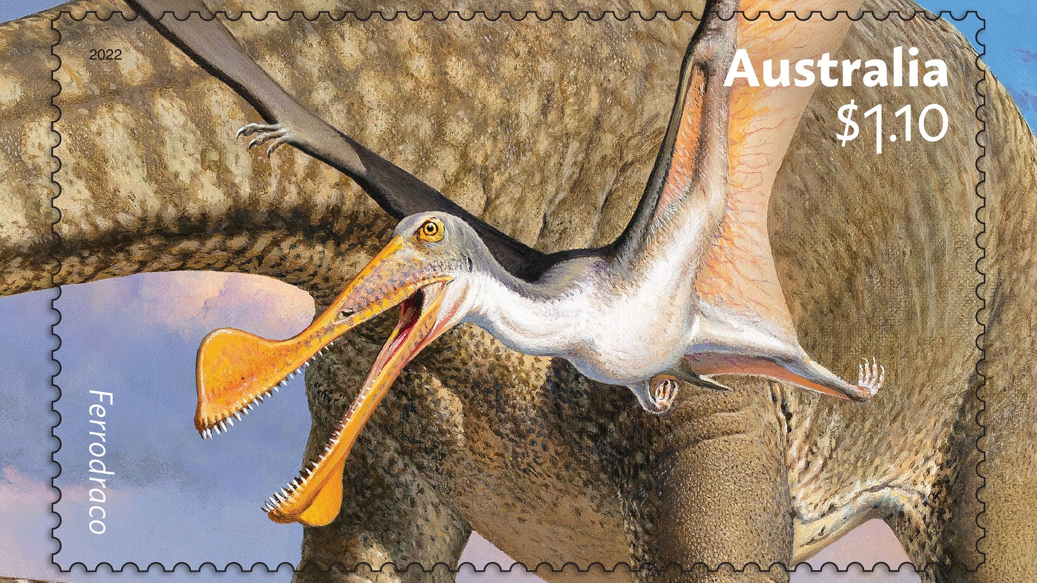 The Australian Dinosaurs stamps feature four dinosaurs and one pterosaur (winged lizard) from the Cretaceous Period (145–66 million years ago).