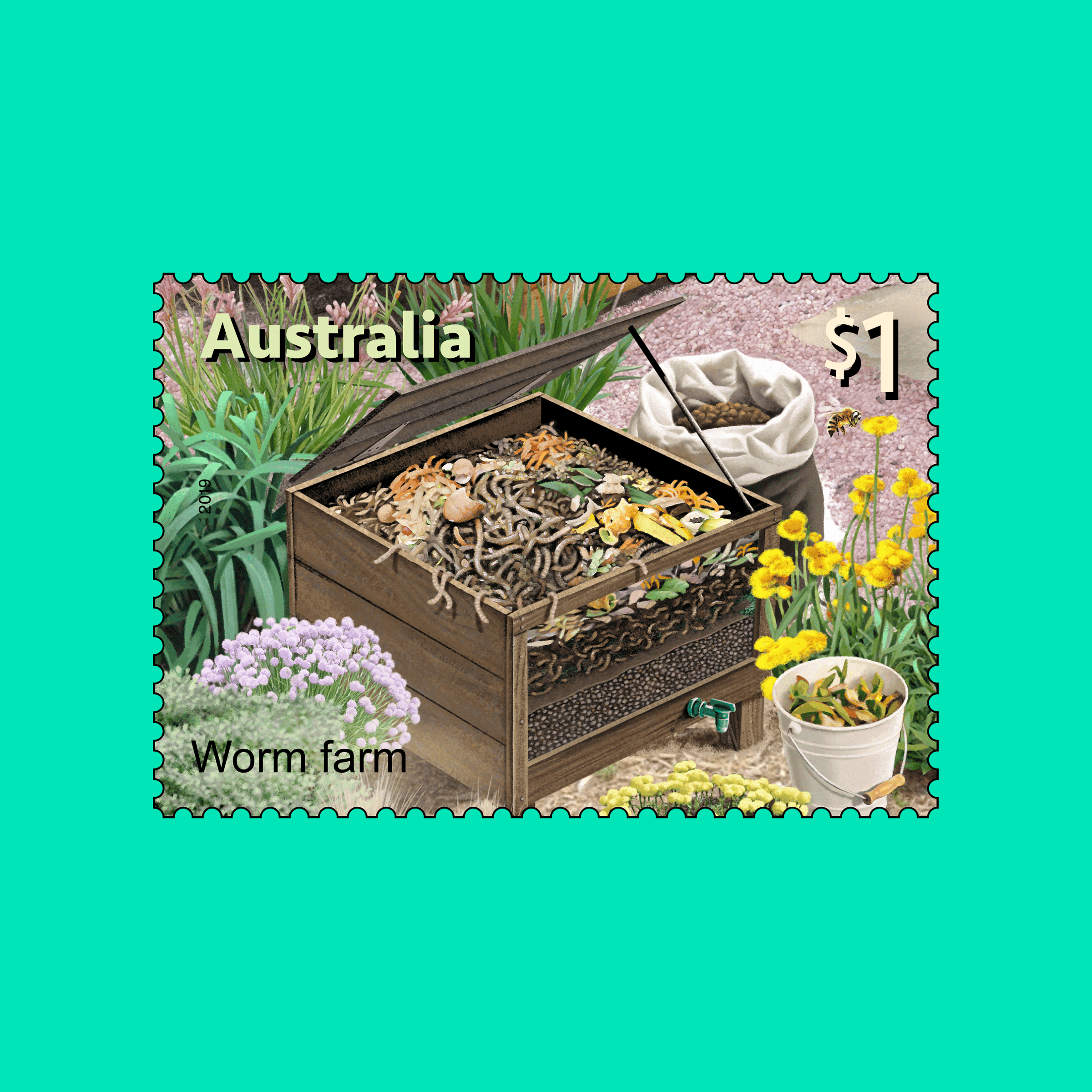 | 1:52 | The next stamp features a worm farm. Earthworms are a vital contributor to our garden’s soil health and they can help us compost too. | Fade to the In the Garden minisheet with a focus on the bottom left one dollar worm farm stamp. Video zooms in and the perforations and stamp text dissolve. |