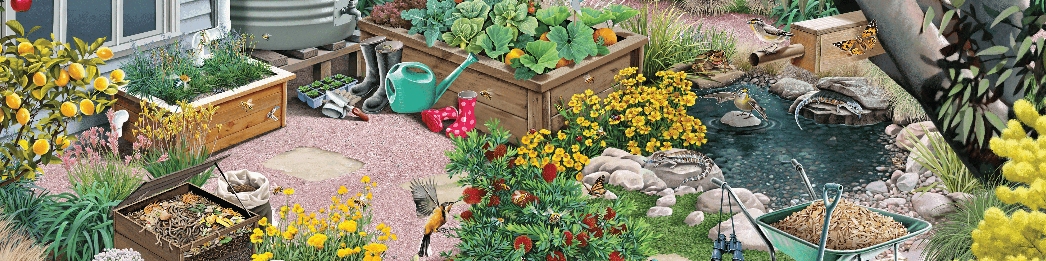 | 1:03 | There are many layers to our garden, including a gum tree that provides shade, | Fade to the video returns to showing the centre of garden scene from the illustration and moves up. Birds are flapping their wings. Bees are flying around flowers. The video moves up along the gum tree where there is another bird perched on a branch. Fade out. |