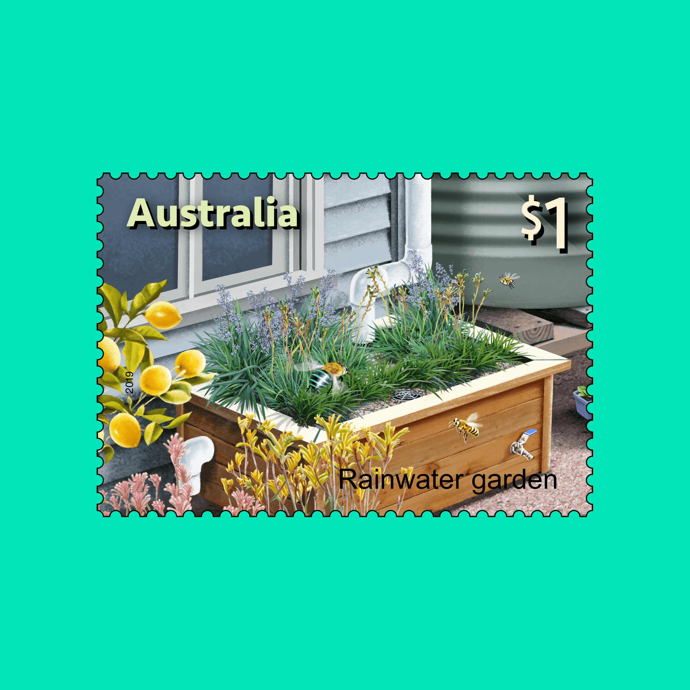 | 1:30 | that attract helpful animal species such as pollinating birds and insects. | The video zooms in to the top-left of the image bringing into sharper focus the one dollar rainwater garden stamp. |
