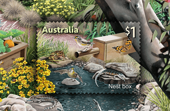 The Striated Pardalote (Pardalotus striatus) is a small (nine to 10 centimetres long) and brightly coloured insect-eating bird, found only in Australia. While there is a fair amount of colour variation in this species, all have white eyebrows and a yellow spot in front of the eye, greenish-grey colouring on the back and a white stripe on the wing. They enjoy living in gum trees, feeding in the leaves in the tree tops, though also sometimes in low shrubs. They help to keep down pest insects in our garden. A pond gives this and other bird species somewhere to bathe and drink, as do bird baths.