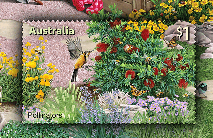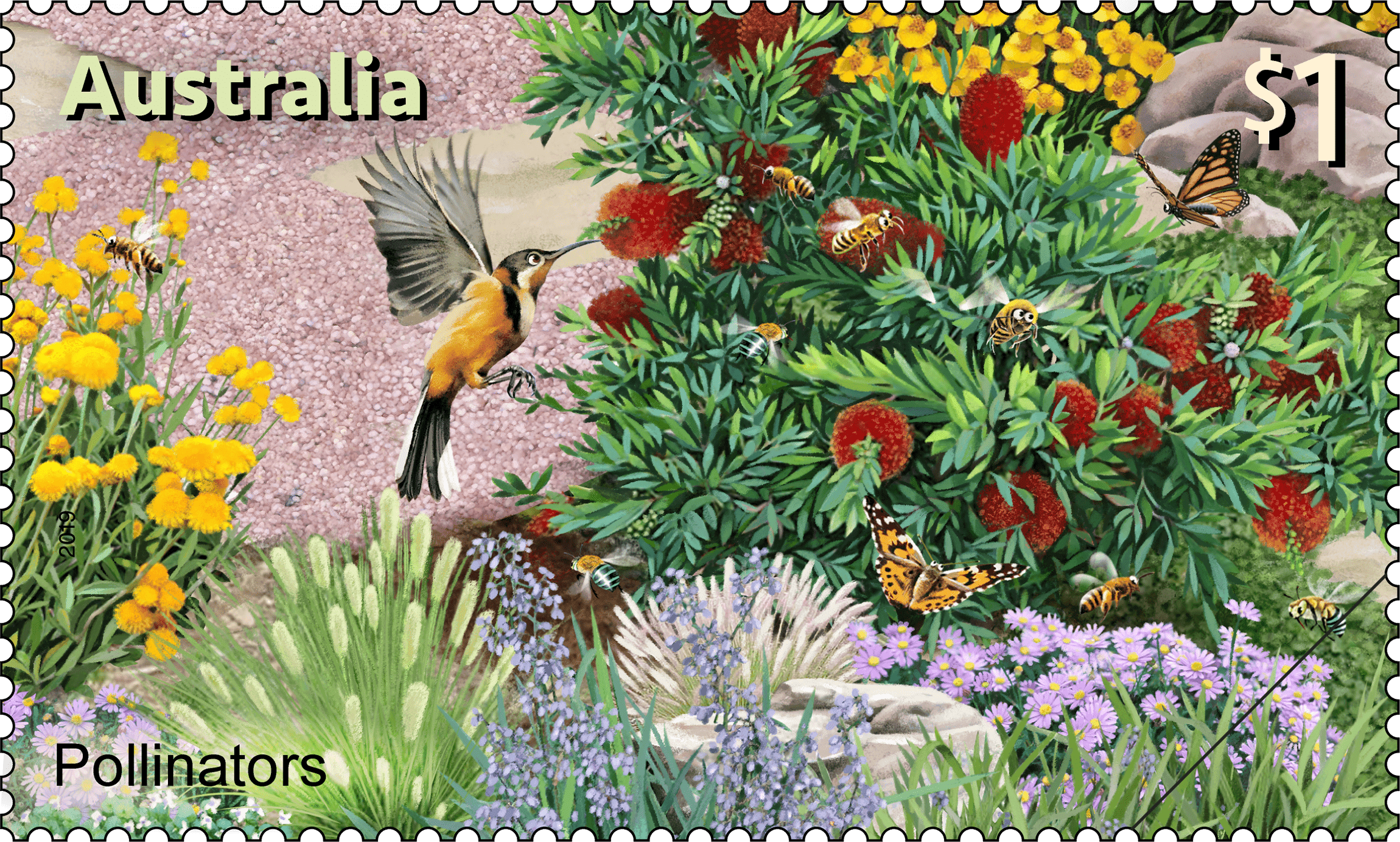 Pollination is a vital process. While some crops such as cereals are wind-pollinated, many crops that we eat (fruits, vegetables and nuts) require animal-assisted pollination to grow and reproduce, as do many native plants. In our garden, birds, butterflies and bees move pollen from the male structures of a plant (“anthers”) to the female structures (“stigma”). This results in fertilisation, which in turn allows the flower to produce seeds and bear fruit, and causes new plants to grow.