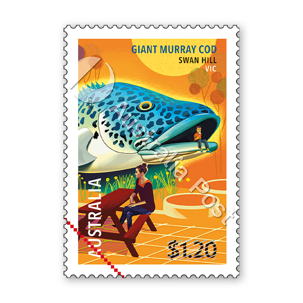 The city of Swan Hill lies on the southern bank of the Murray River in northwest Victoria. The Giant Murray Cod, a tribute to a legendary native fish, is located outside the city railway station on a small park with picnic table and BBQ facilities. Fifteen metres long, three metres wide and five metres high, the steel and fiberglass Giant Murray Cod is at once a symbol of civic pride, an inducement for tourist snaps and highlights awareness that numbers of this species, once common in the Murray-Darling river system, have been greatly reduced. It was originally built in 1991 as a movie prop for a film, Eight Ball. After the film was made, the big fish was donated to the community of the City of Swan Hill.