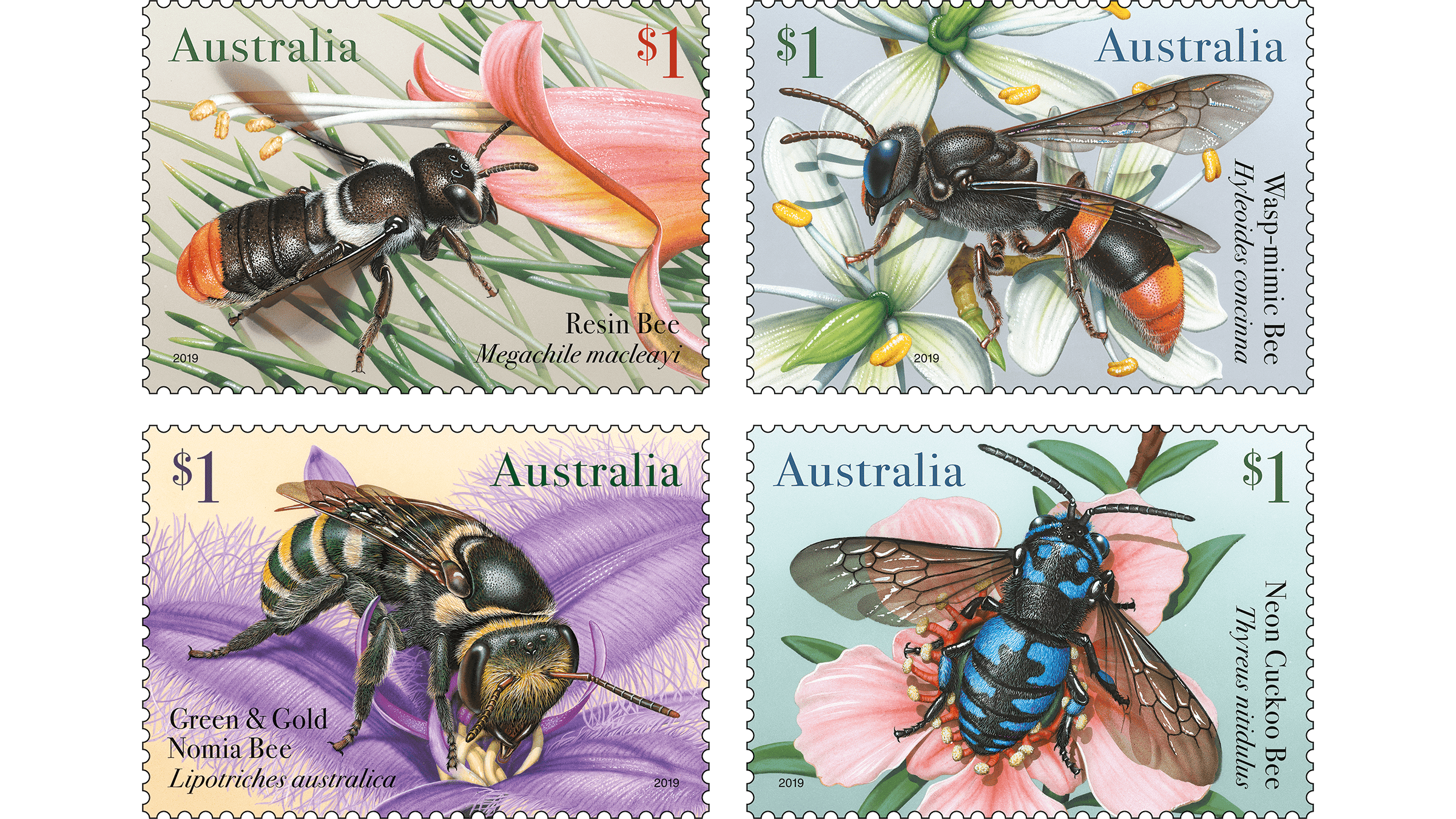 The stamp issue depicts representatives from the four main native bee families in Australia: Resin Bee (Megachile macleayi), Green and Gold Nomia Bee (Lipotriches australica), Wasp-mimic Bee (Hyleoides concinna) and Neon Cuckoo Bee (Thyreus nitidulus).