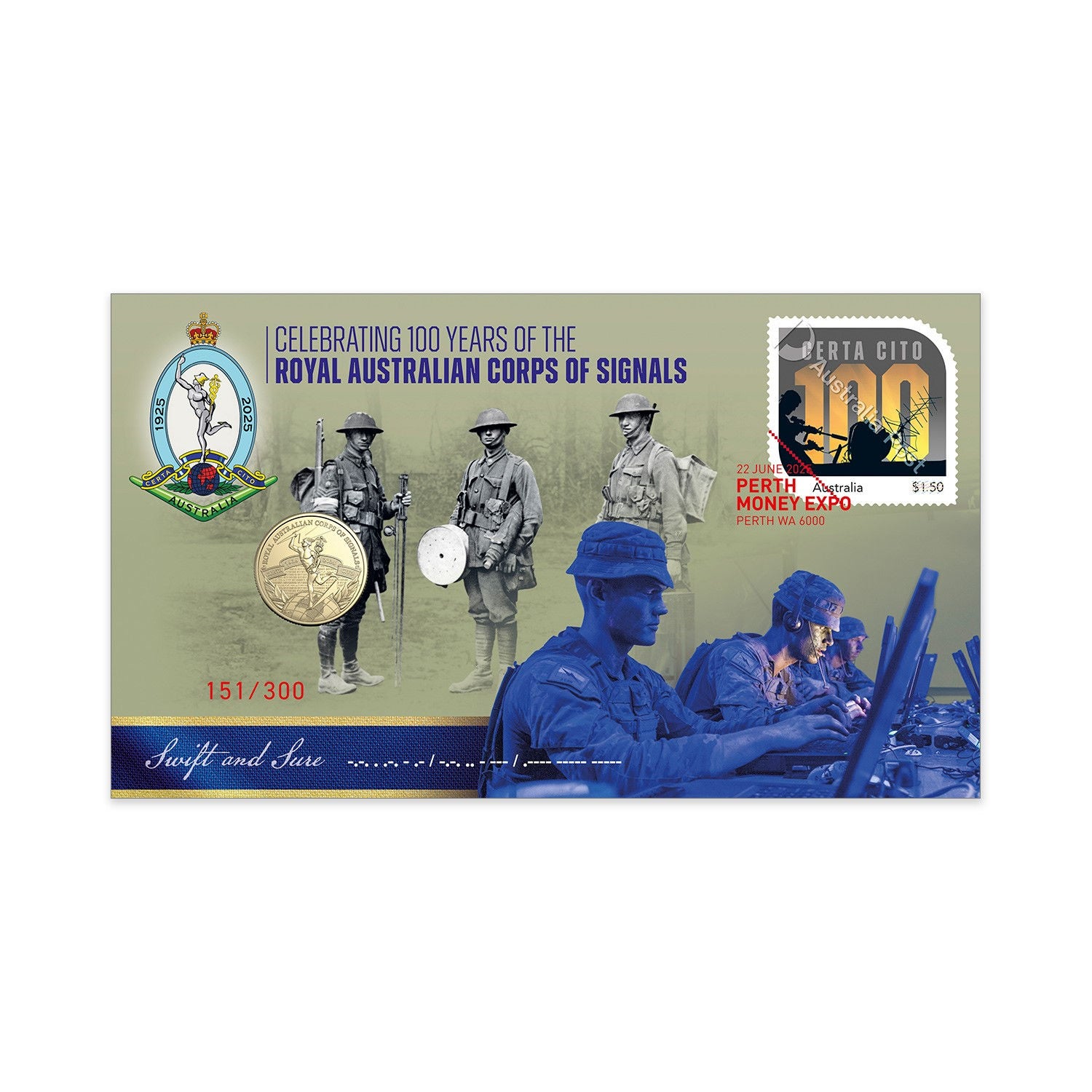 Only 300 of the Centenary of Royal Australian Corps of Signals PNC has been produced, with 150 to be released each day. This PNC features a $1 AlBr uncirculated coin from the Royal Australian Mint as well as a coloured and foiled daily postmark at $35 RRP each.