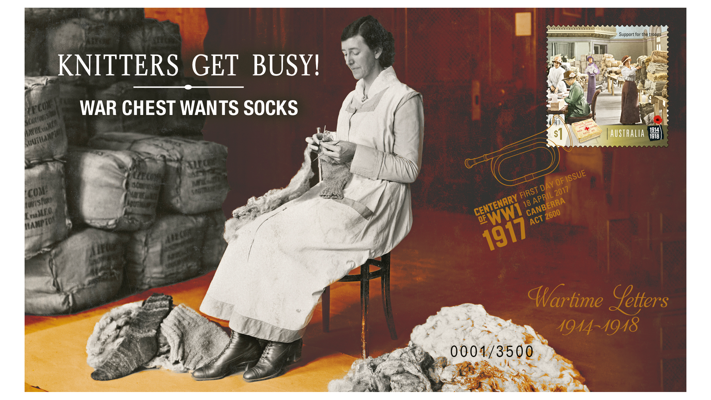 This prestige cover showcases the incredible effort by women on the home front, who knitted thousands of pairs of woollen socks that were sent to soldiers on the Western Front. It is part of the Wartime Letters 1914–1918 prestige cover range and is limited to 3,500.