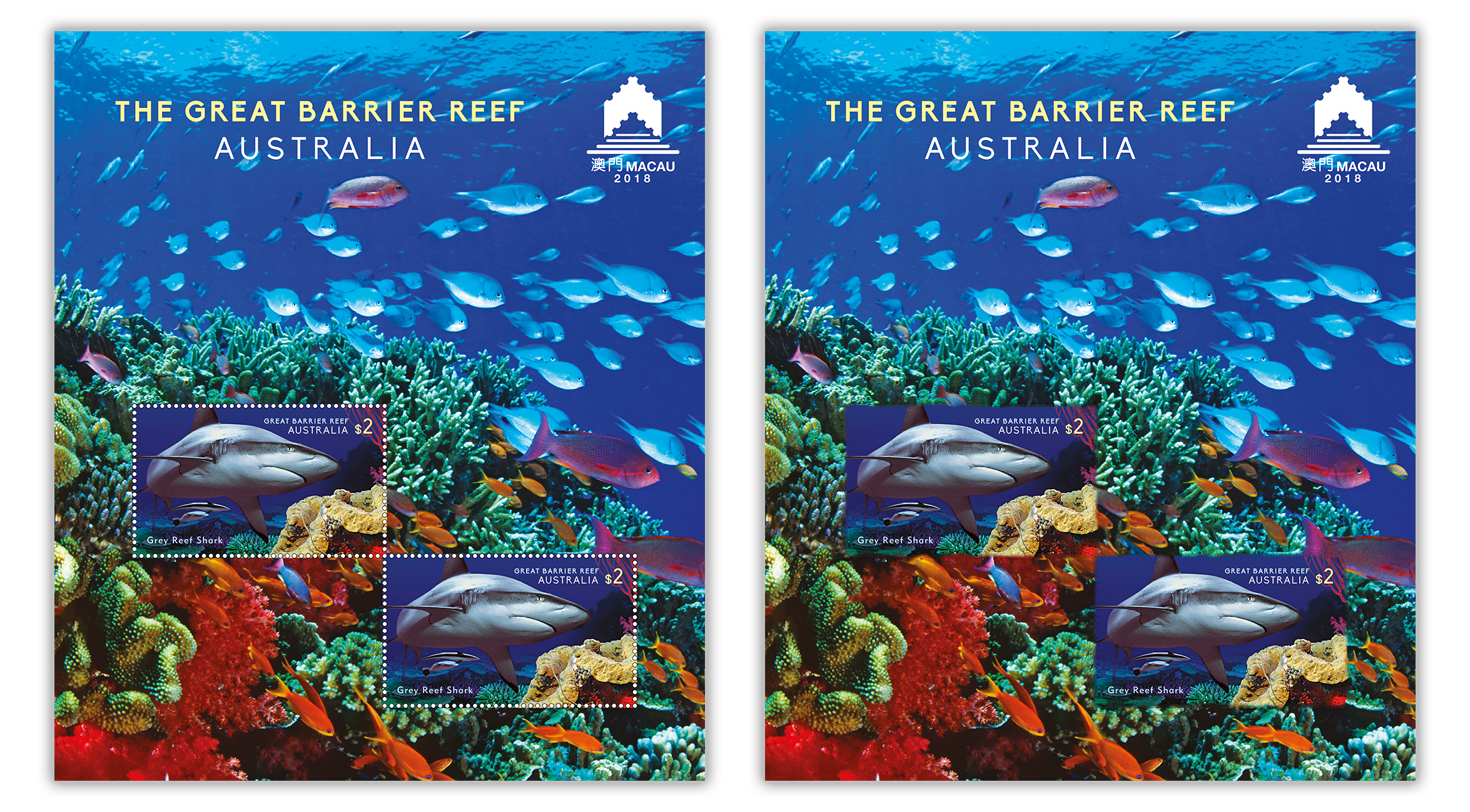 A special sheetlet containing two $2 Reef Shark stamps from the Reef Safari stamp issue will be available at the Macau show. The show sheetlet is imperforate, allowing show attendees to place it in the perforating machine at the Australia Post booth.