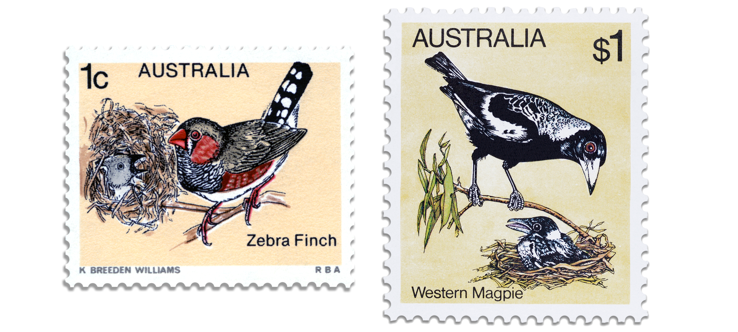The next Australian philatelic ‘first’ involving bird-themed stamps occurred in 1978, with the release of the first in a series Australian Birds definitive issues (1978–80), designed by Kay Breedon Williams, a highly regarded Australian wildlife artist and co-author and illustrator of seven books on Australian wildlife.
