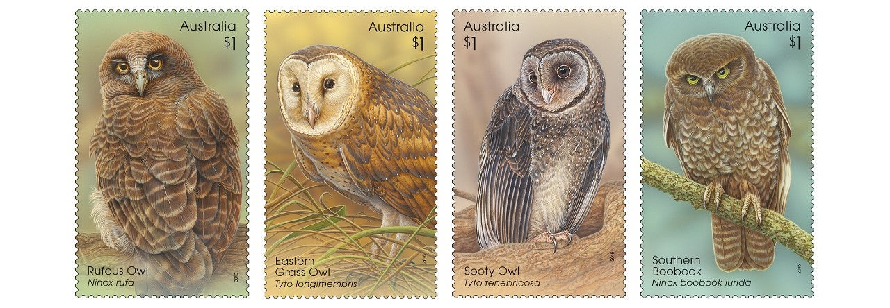 In 2016, Christopher Pope illustrated the stamp designs for Owls: Guardians of the Night, which comprised four double-definitive sized stamps featuring four captivating species of owl: Sooty Owl (Tyto tenebricosa), Rufous Owl (Ninox rufa), Eastern Grass Owl (Tyto longimembris) and Southern Boobook (Ninox boobook lurida).