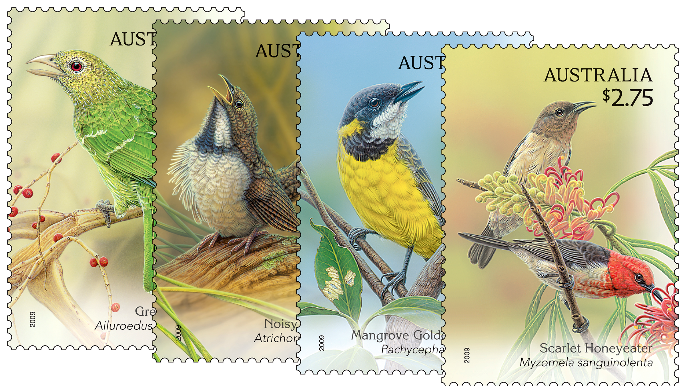 The haunting, lifelike illustrations showcase these magnificent and majestic nocturnal birds of prey in their natural habitat, using dark and muted tones. The stamps clearly left an impression with collectors, as the Owls: Guardians of the Night stamp issue topped the Australia Post Stamp Poll for 2016. Christopher Pope’s Australian Songbird designs also topped the 2009 Stamp Poll. Those stamps showcased species from four families of Australian songbird.