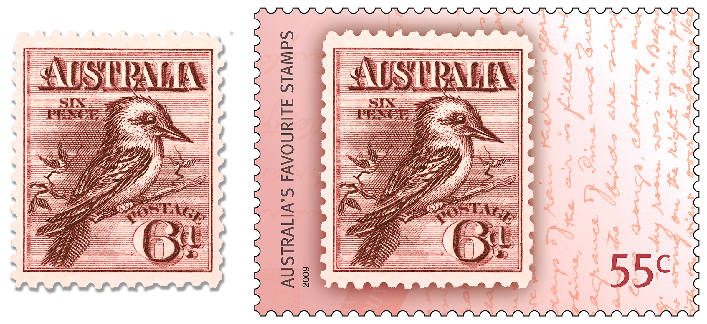 In fact, the Kookaburra has proven to be a popular stamp subject – most likely because this ‘laughing’ bird has become synonymous with the sights and sounds of the Australian bush. Even though the 1914 and 1928 Kookaburra design was modified in 1932 and in 1937 (each time becoming more ‘delicate’ in appearance), it’s the robust and cheerful 1914 design that still resonates with collectors. In fact, a reproduction of the 6d 1914 Kookaburra stamp featured in the Australia’s Favourite Stamps (a 2009 issue celebrating 200 years of Australia Post) as a 55c stamp. A reproduction of the 1928 3d Kookaburra was featured on the stamp and minisheet issued to celebrate 1978 National Stamp Week, and Kookaburra stamps have formed part of the 1983 and 1990 Christmas stamp issues, 1986 and 1993 Australian Wildlife, 2005 Bush Wildlife and 2010 Australian Kingfishers.