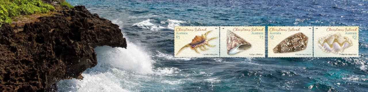 The Christmas Island Shells stamp issue, released on 23 August 2016, features beautiful illustrations, by Roger Swainston, of four species of marine mollusc found in the tropical waters around Christmas Island.