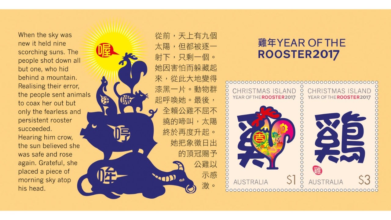 The Christmas Island Lunar New Year: Year of the Rooster 2017 stamp issue is available from 10 January 2017 online, at participating Post Offices and via mail order on 1800 331 794 (+61 3 9887 0033 from overseas), while stocks last.