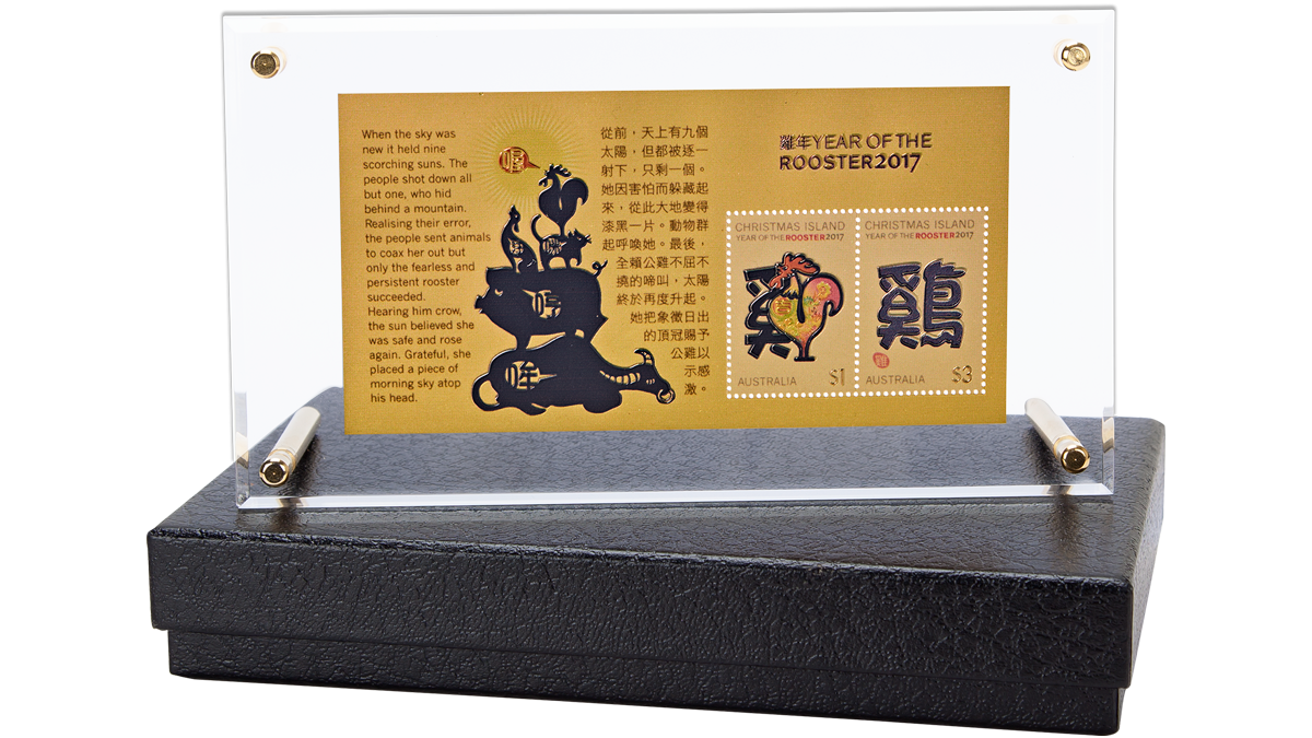 Only 500 of this special 24 carat gold Year of the Rooster 2017 minisheet have been produced! It comes in a clear perspex presentation mount, and makes a beautiful gift or memento for those born in the Year of the Rooster.