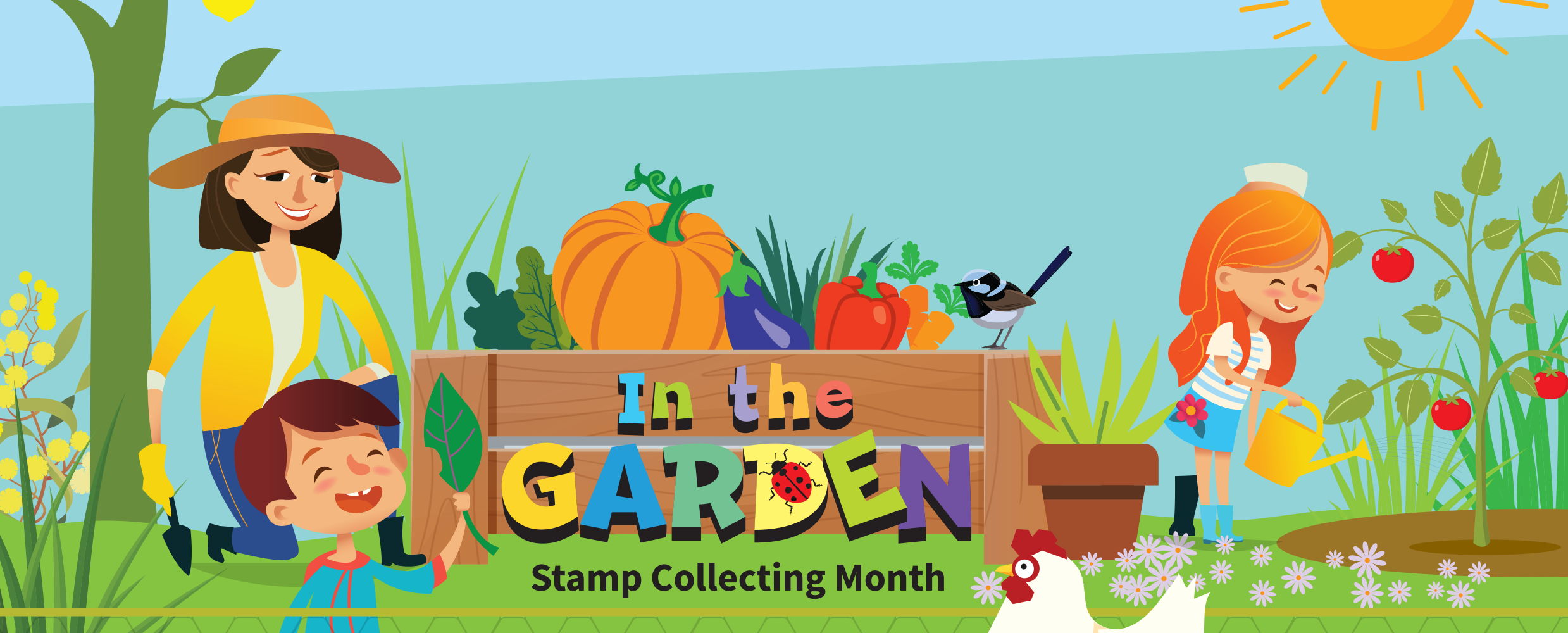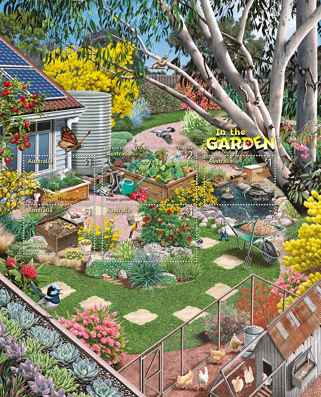The “In the Garden” stamp issue will be released on 1 August 2019 for SCM. Illustrator Andrew Hopgood has brought to life a thriving and inviting garden space, including five bright and colourful stamp designs that focus on important sustainable aspects of the garden, especially activities that families can enjoy together. The stamps feature a rainwater garden, a nest box, a worm farm, and pollinators, which are vital to ensuring plant growth and reproduction.