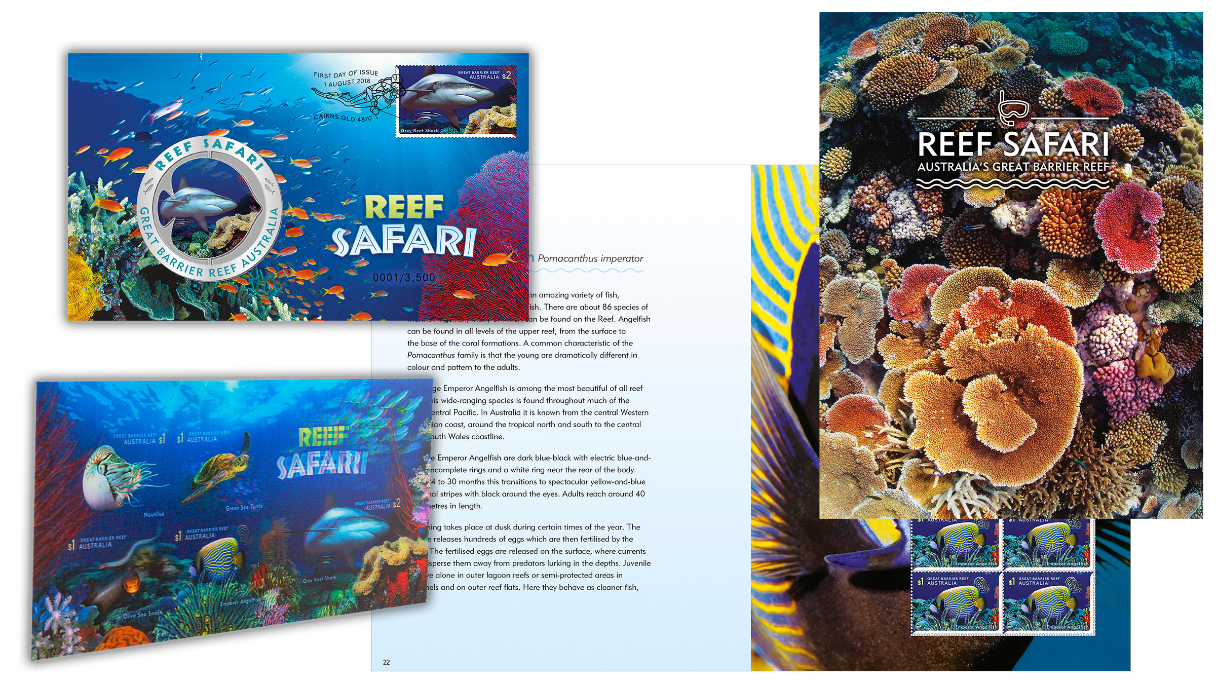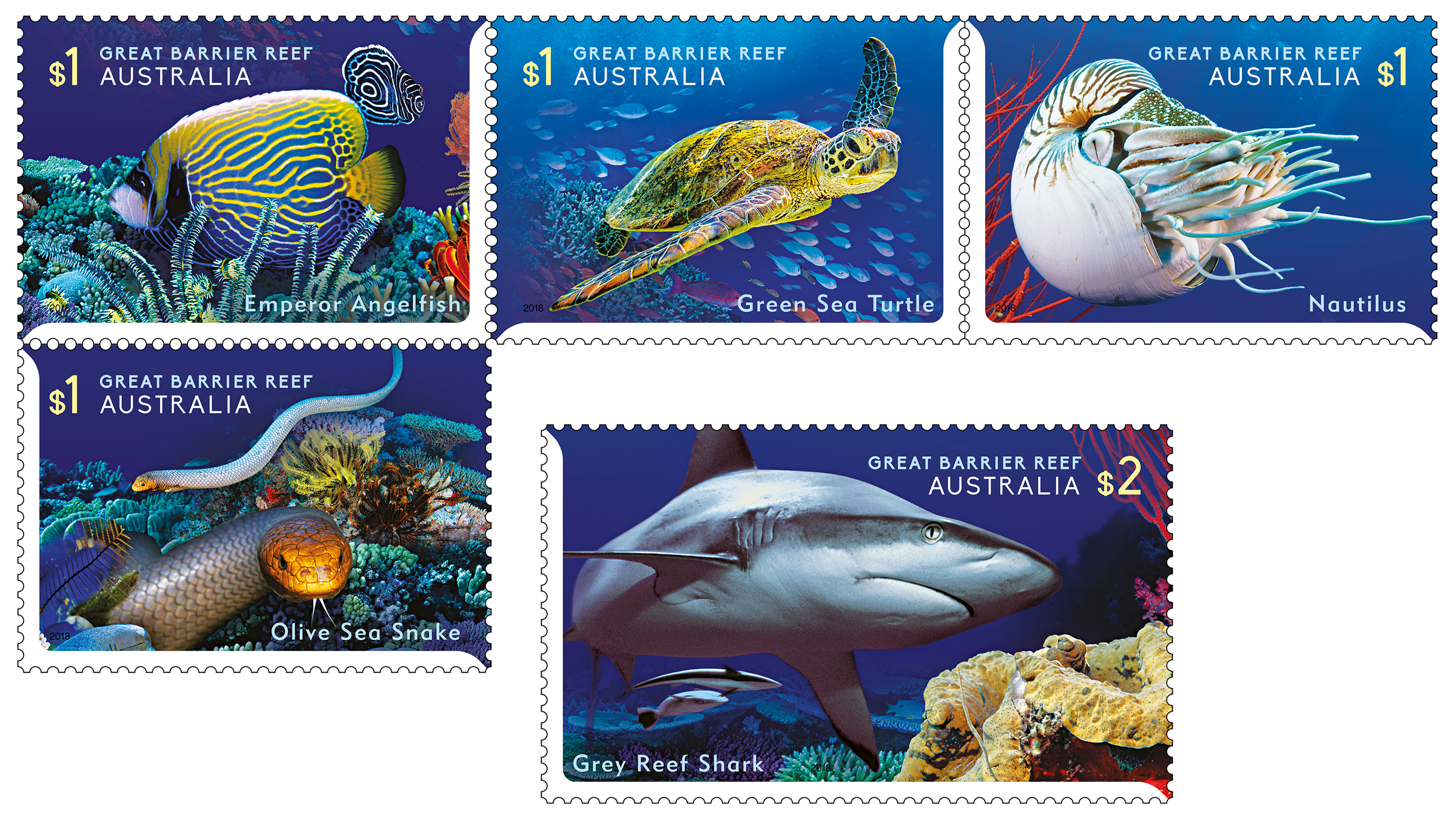 The Reef Safari stamp issue, released on 1 August 2018, presents bright and colourful stamp designs featuring five of the many different creatures that live in the reef’s complex ecosystem: Nautilus (Nautilus pompilius), Green Sea Turtle (Chelonia mydas), Olive Sea Snake (Aipysurus laevis), Emperor Angelfish (Pomacanthus imperator) and the Grey Reef Shark (Carcharhinus amblyrhynchos).