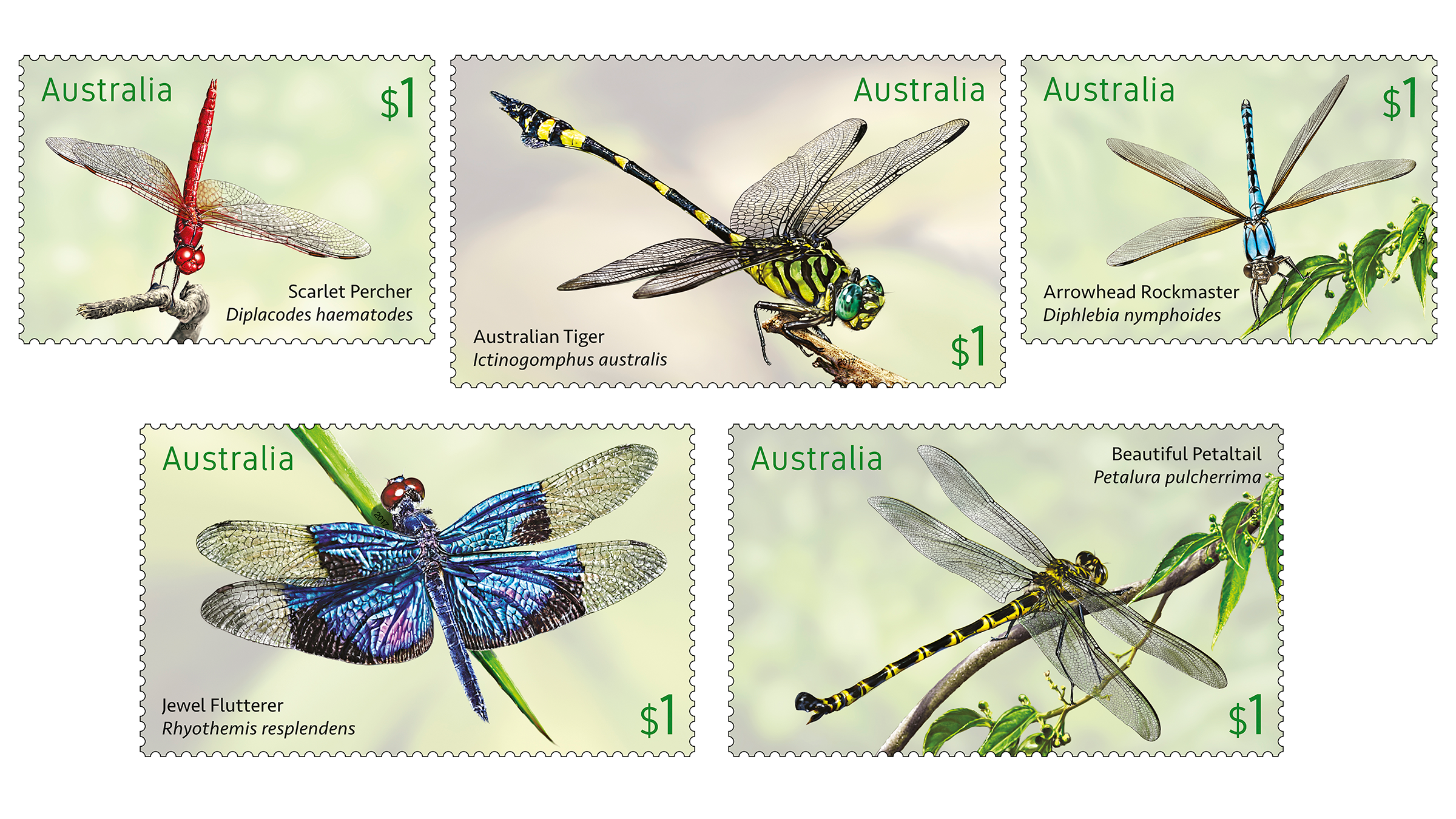 The Dragonflies stamp issue, released on 1 August 2017, presents four magnificent dragonfly species and one spectacular damselfly: Scarlet Percher (Diplacodes haematodes), Arrowhead Rockmaster (Diphlebia nymphoides), Australian Tiger (Ictinogomphus australis), Jewel Flutterer (Rhyothemis resplendens) and Beautiful Petaltail (Petalura pulcherrima). The stamp illustrations, by Owen Bell, are incredibly life-like.