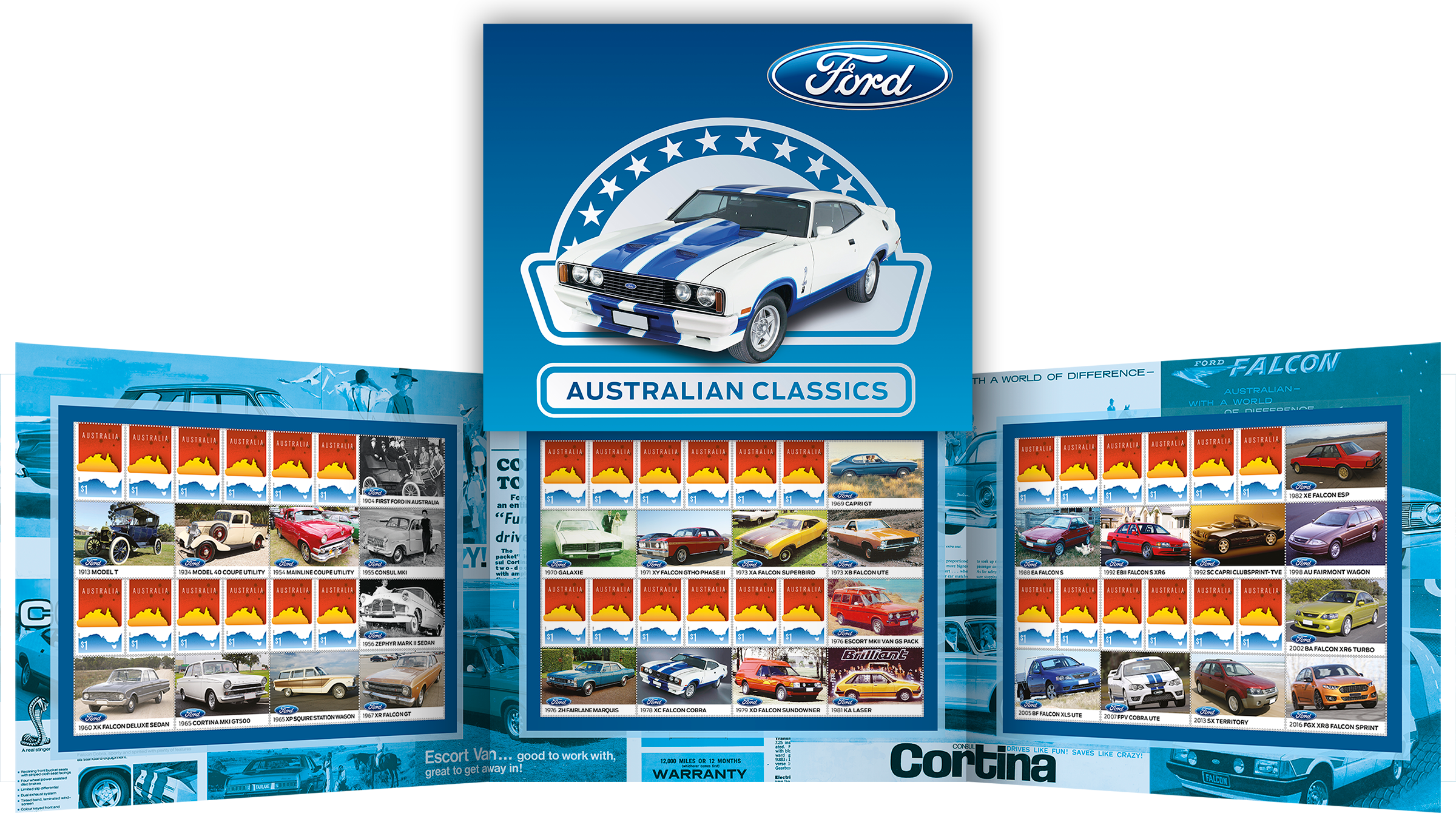 The Ford Australian Classic Vehicles licensed stamp pack is available from 29 September 2017, online, at participating Post Offices and via mail order on 1800 331 794, while stocks last.
