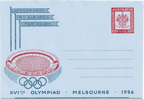 The first commemorative aerogramme was issued on 12 November 1956 for the Melbourne Olympic Games. The imprinted stamp features the Arms of the City of Melbourne.