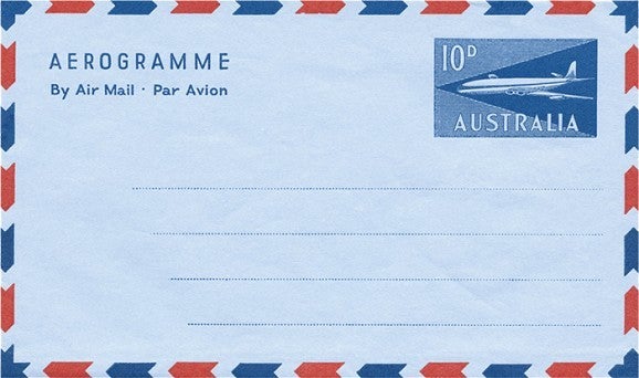 “Air letter” changed to “Airletter” in 1945. “Airletter” became “Aerogramme” in 1953, as a result of a decision at the previous year’s Brussels Congress of the Universal Postal Union. The tri-coloured border design was introduced in 1954, and in 1959 the addition of an extra sealing flap meant an increase in the available writing area.