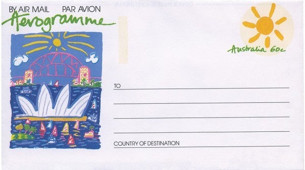 Traditionally aerogrammes had been produced on blue-tinted paper, but to accommodate full colour designs aerogrammes use a white paper base. In 1989, for example, Australian artist and designer Ken Done illustrated four new full colour definitive aerogrammes, to accommodate the (then new) 60 cent airmail rate.
