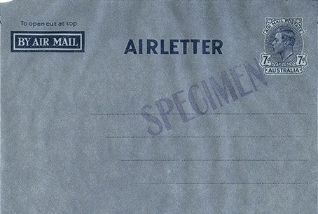 The first air letter featured an imprinted 7d (seven pence) King George VI stamp, which represented a considerable reduction over the 1s 6d (one shilling and six pence) postage for a half-ounce air mail letter. It consisted of blue printing and overlay on yellow paper.
