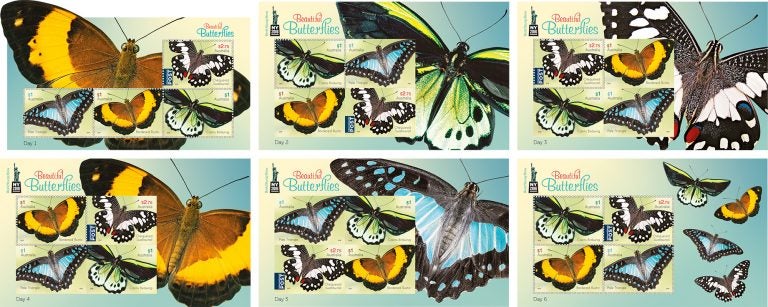 To celebrate the release of the Beautiful Butterflies stamp issue, Australia Post released six exclusive show minisheets, with each version displaying different printing techniques. In addition, a limited number of foiled cancelled minisheets was released each day to Australia Post booth visitors at the show.