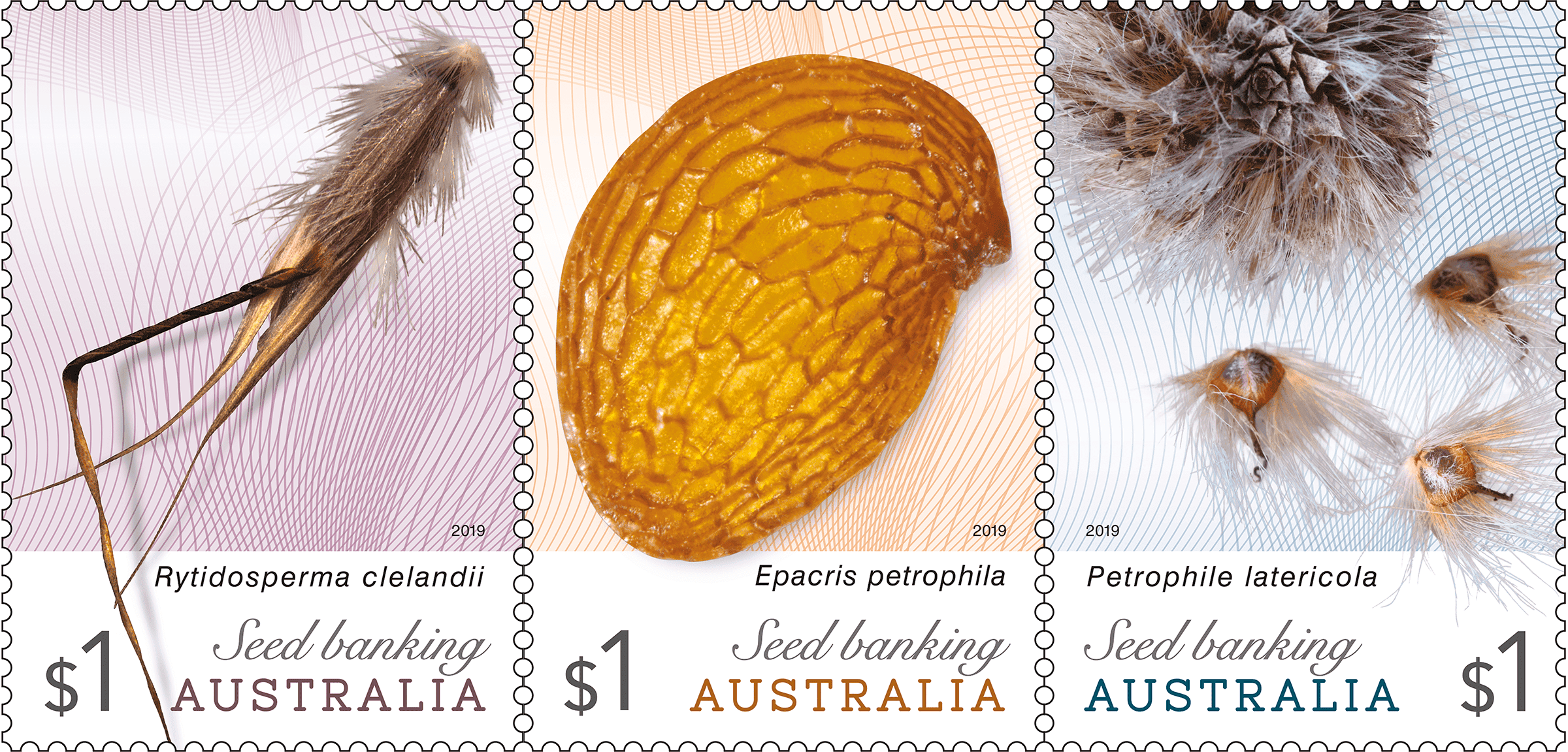 To recognise the importance of this work, the Seed Banking Australia stamp issue is being released on 8 October 2019. The stamps, designed by Sonia Young of the Australia Post Design Studio, present seeds of three native plant species: Rytidosperma clelandii (a rare, perennial grass from South Australia), Epacris petrophila (a near-threatened alpine shrub from the Australian Alps and high-altitude areas in Victoria and Tasmania) and Petrophile latericola (an endangered shrub from Western Australia).