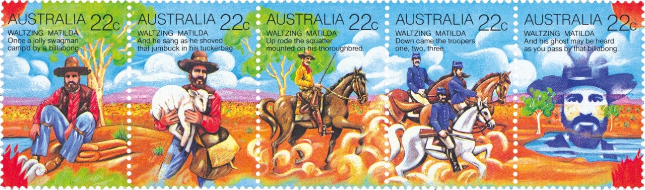 From 1978 a third category of stamps, special stamp issues, was introduced for short-term sale, featuring a wide range of subjects such as trees, racehorses, ferries, steam locomotives, fishing and dogs. In 1980 the issue of five stamps in a se-tenant strip illustrating the story of Waltzing Matilda marked a high point of public fascination with buying new stamp issues.