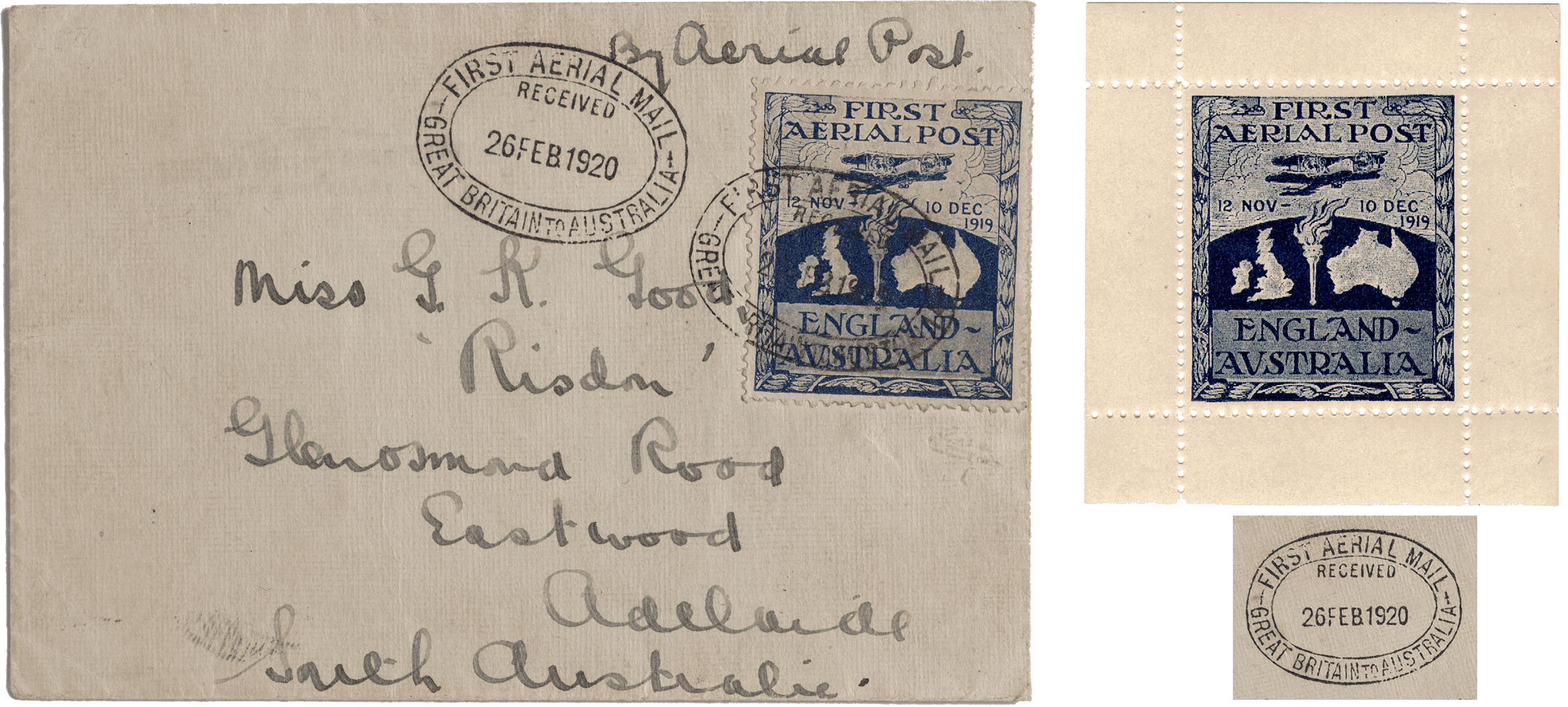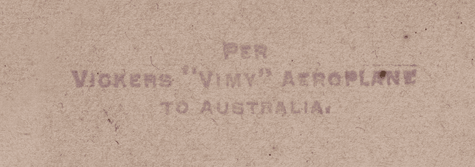 On board the flight, Ross Smith had in his possession a handstamp “PER / VICKERS “VIMY” AEROPLANE / TO AUSTRALIA”, which he applied to the mail.
