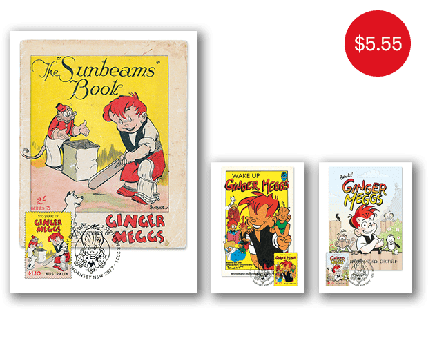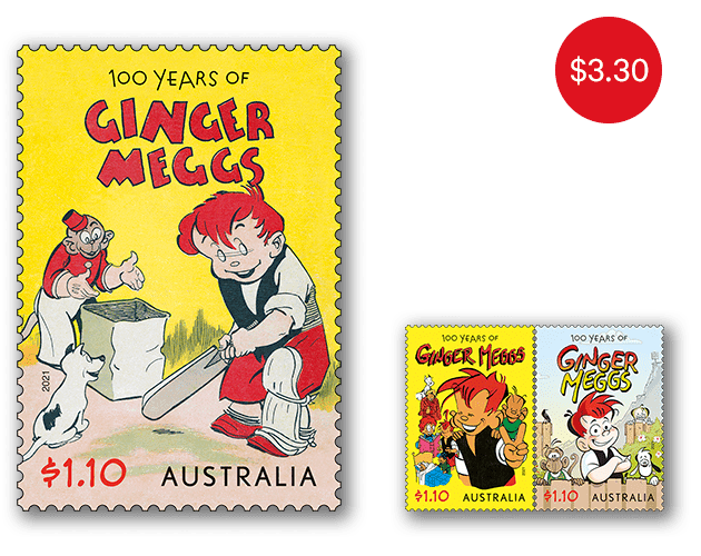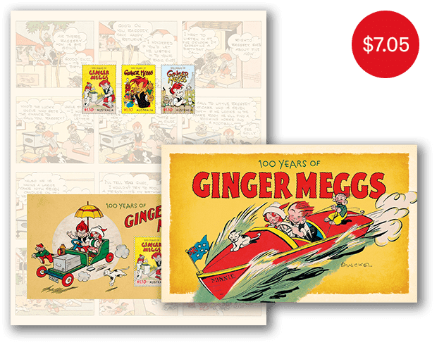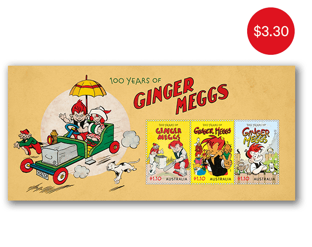 The 100 Years of Ginger Meggs stamp pack contains all three stamps and minisheet from the stamp issue presented in high quality folder.