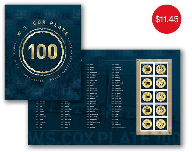 The 100th Running of the W.S. Cox Plate sheetlet pack contains the sheetlet of 10 x $1.10 stamps from the stamp issue presented in high quality folder.