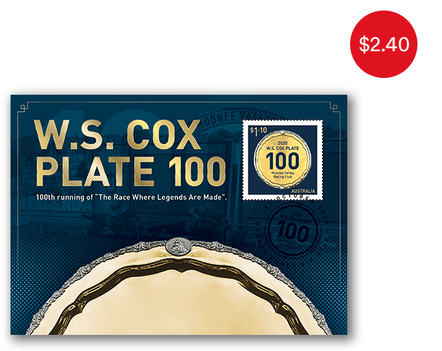 The stamp design features the unique 100th W. S. Cox Plate Trophy, which was manufactured in Australia. Its plate and feet are 9ct solid yellow gold, with 9ct white gold rosemount edges and emblems. The trophy weighs approximately 1.6 kilograms.