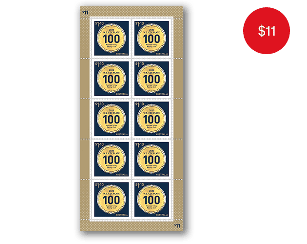 The gummed sheetlet contains 10 x $1.10 stamps from the 100th Running of the W.S. Cox Plate stamp issue.