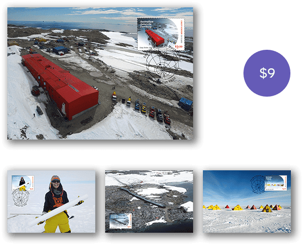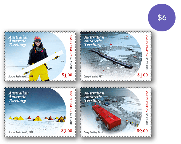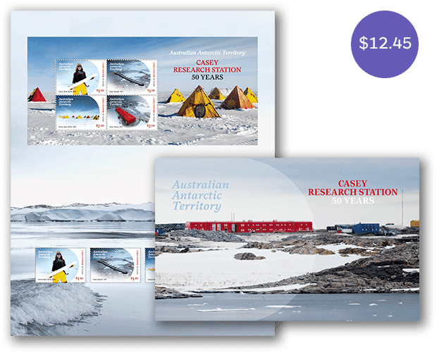 The AAT Casey Research Station: 50 Years stamp pack contains all four stamps and minisheet from the stamp issue presented in high quality folder.