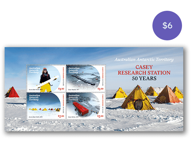 The AAT Casey Research Station: 50 Years minisheet consists of the four stamps from the issue incorporated into a miniature stamp sheet.