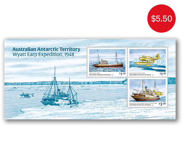 The AAT: Wyatt Earp Expedition, 1948 minisheet consists of the three stamps from the issue incorporated into a miniature stamp sheet.