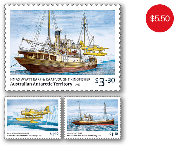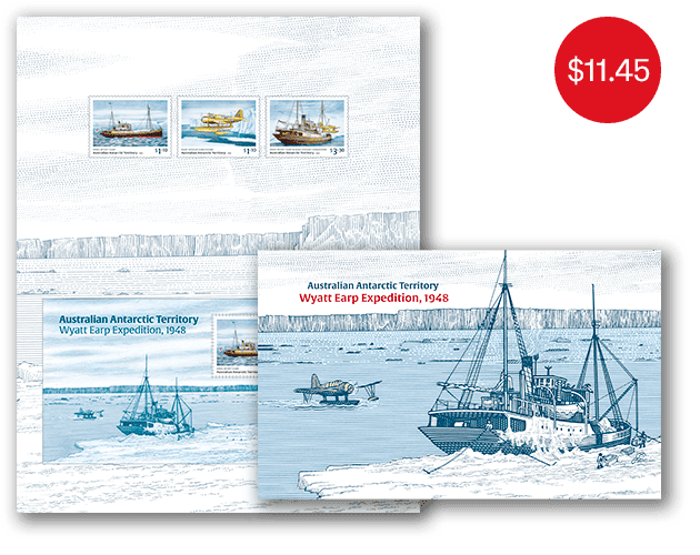 The AAT: Wyatt Earp Expedition, 1948 stamp pack contains all three stamps and minisheet from the stamp issue presented in high quality folder.