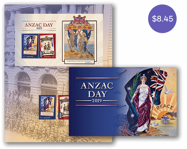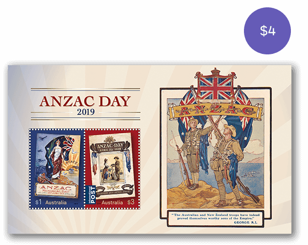 The Anzac Day 2019 minisheet consists of the two stamps from the issue incorporated into a miniature stamp sheet.