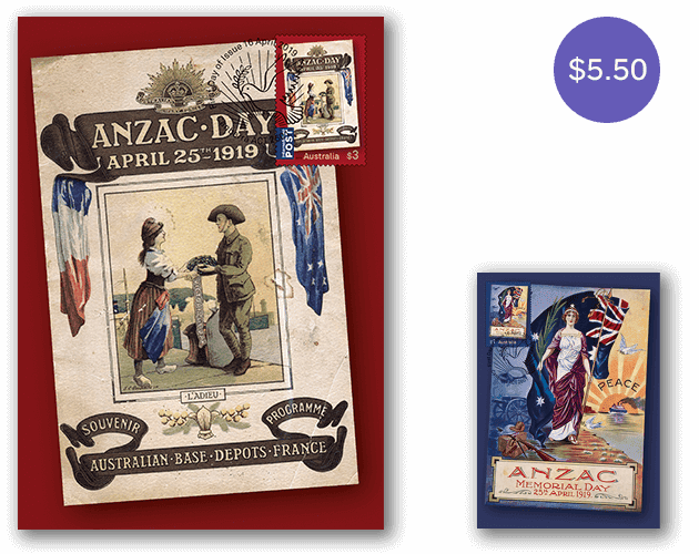 The souvenir program featured on the international-rate stamp, was produced for a 1919 Anzac Day event held for allied soldiers at an Australian depot in Rouelles, France. The day included sporting competitions and music performances and was attended by many high-ranking officials. As well as themes of victory and peace, the cover design portrays the long-standing gratitude felt by the French people for the efforts of Australian troops during WWI, which continues to this day.