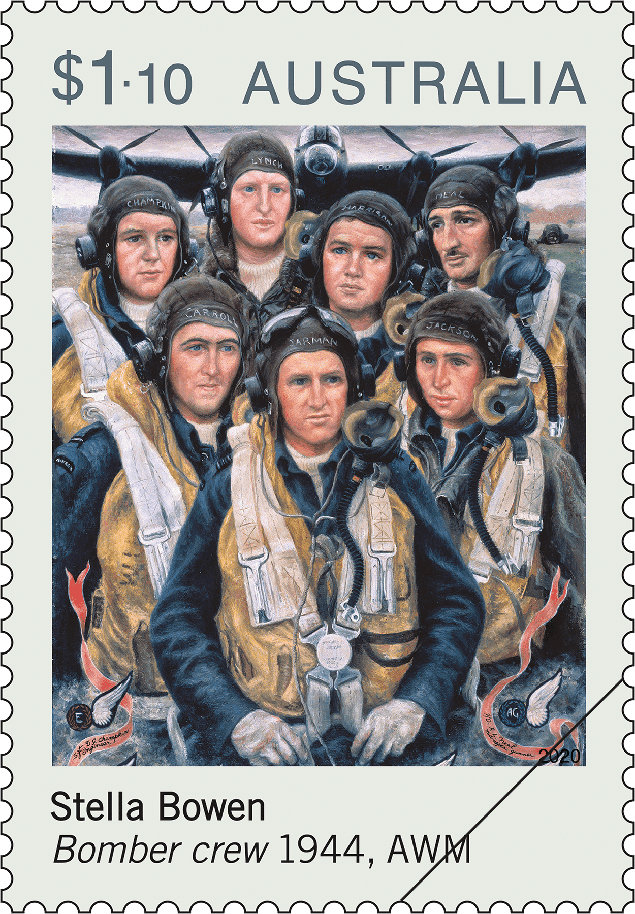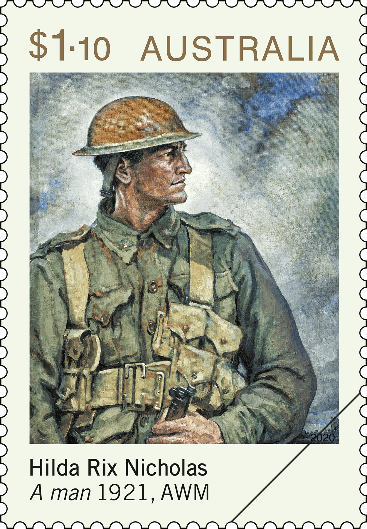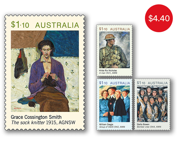 This stamp issue features oil on canvas paintings that were inspired by the events of the two World Wars on the home front and in combat overseas. William Dargie and Stella Bowen were both employed as Australian official war artists during World War II. Grace Cossington Smith and Hilda Rix Nicholas painted subjects that had personal significance.