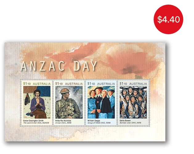 The Anzac Day 2020 minisheet consists of the four stamps from the issue incorporated into a miniature stamp sheet.