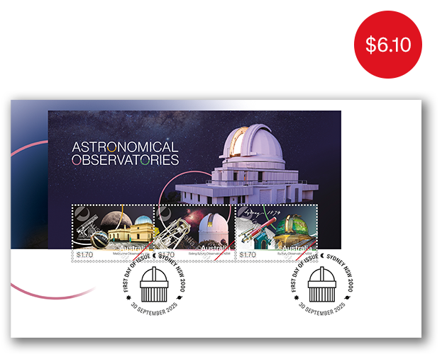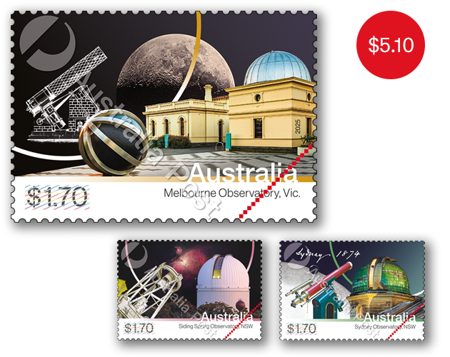 The stamp features the historic 29-cm refractor telescope, installed in 1874 and today the oldest telescope in Australia still in regular use. This telescope was used to view the 1874 Transit of Venus, with a detail from contemporary observations shown in the background.