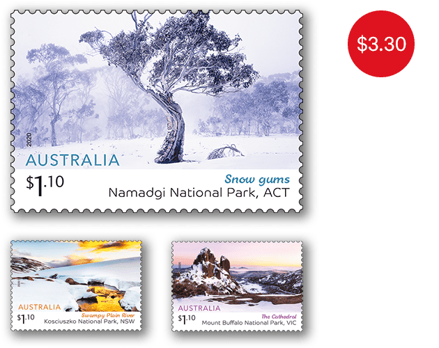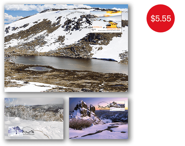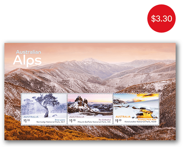 This stamp issue showcases three spectacular alpine environments within the Australian Alps: snow-covered woodlands in Namadgi National Park, in the ACT; the spectacular granite tor, known as the Cathedral, in Mount Buffalo National Park, Victoria; and in Kosciuszko National Park, NSW, the picturesque Cootapatamba valley, through which the Swampy Plain River flows.
