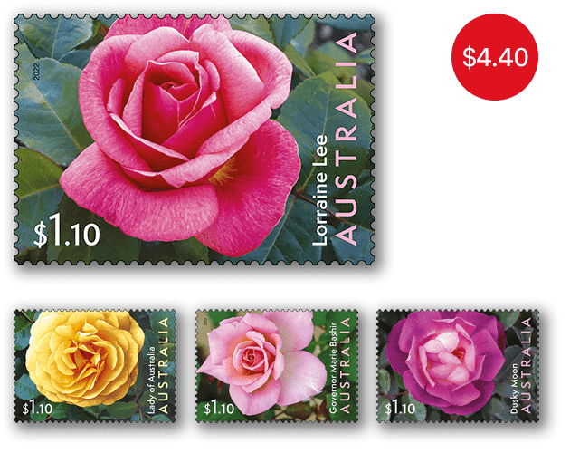 The four roses featured in this stamp issue are examples of high-quality Australian-bred roses that represent a diversity of colour, appearance, type, breeder and breeding location. The issue is being released in the lead-up to the World Rose Convention 2022, which is being held in Adelaide between 27 October and 3 November.