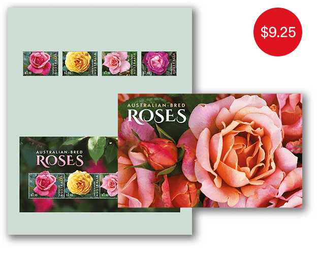 The Australian-bred Roses stamp pack contains all four stamps and minisheet from the stamp issue presented in a high-quality folder.