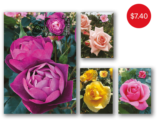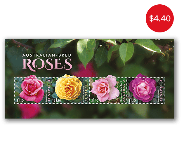The Australian-bred Roses minisheet consists of the four stamps from the issue incorporated into a miniature stamp sheet.