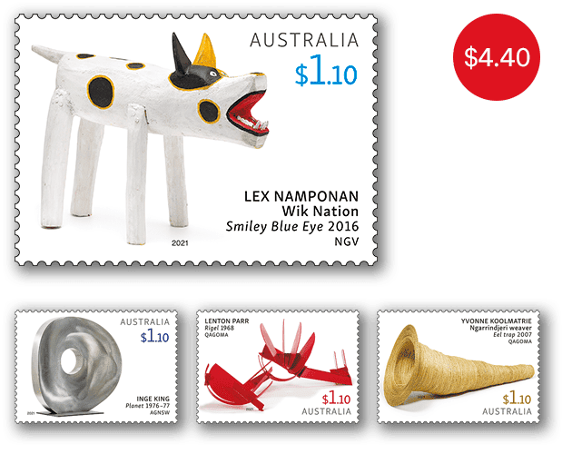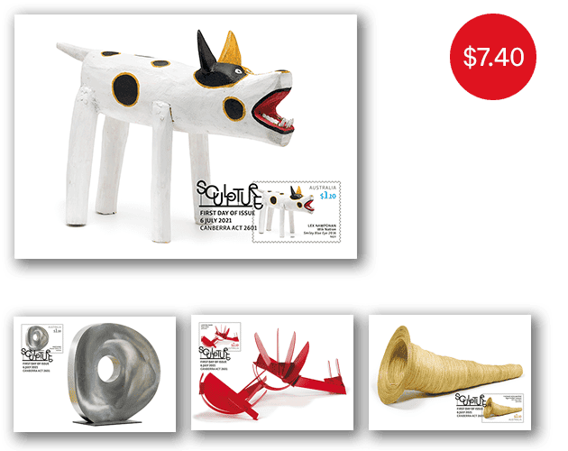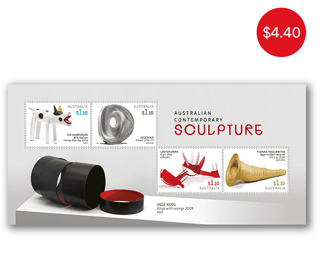 Small-scale artworks by four eminent Australian sculptors of the last 60 years are featured in this stamp issue. Inge King AM (1915–2016) and Lenton Parr AM (1924–2003) were active in Melbourne after World War II; Yvonne Koolmatrie (b. 1944) is a celebrated practitioner of traditional coil bundle weaving techniques; and Lex Namponan (b. 1971) has recently gained national attention for his witty wooden sculptures of camp dogs.