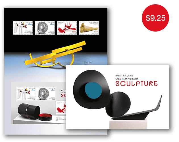 The Australian Contemporary Sculpture stamp pack contains all four stamps and minisheet from the stamp issue presented in high quality folder.