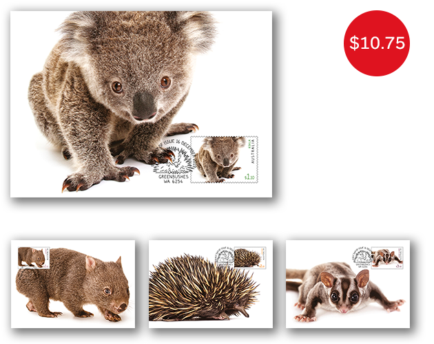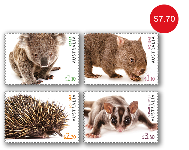 A follow-up issue to the Australian Fauna stamp issue, released in March 2019, this stamp issue presents four fascinating Australian mammals: a ground-dwelling marsupial – the Common Wombat (Vombatus ursinus); two tree-dwelling marsupials – the Koala (Phascolarctos cinereus) and the Sugar Glider (Petaurus breviceps); and a monotreme – the Short-beaked Echidna (Tachyglossus aculeatus). The animals presented span a variety of physical and behavioural traits.